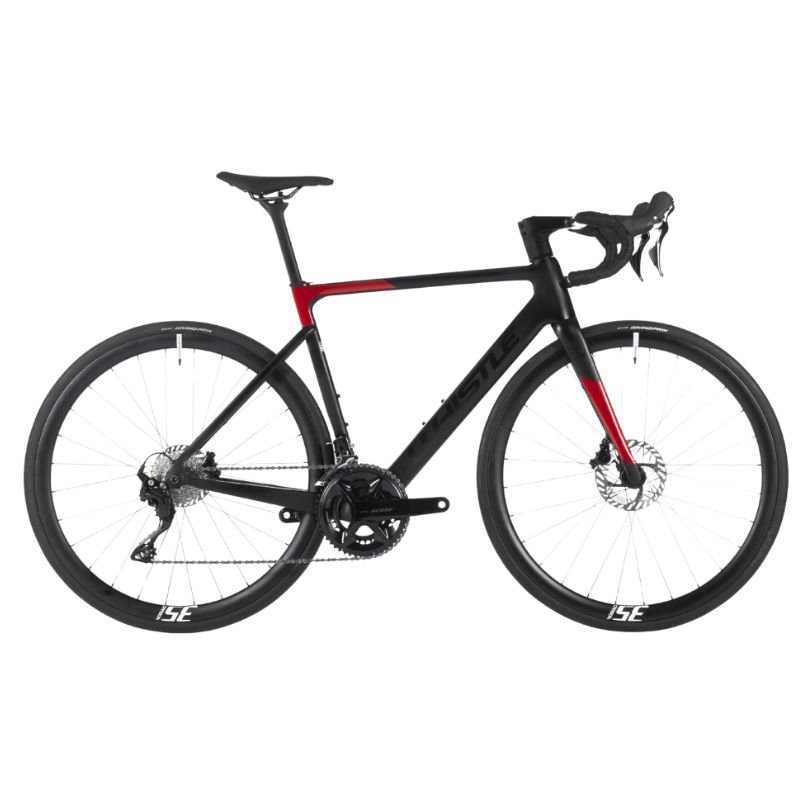 Roues & pneus | Roues Whistle C35 full carbone, tubeless ready, moyeux type Ratchet 36T, pneus assez étroits de série (700×28) avec possibilité d’adapter jusqu’à 700×30 |